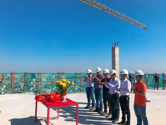 Đại diện Chủ Đầu tư: Công ty Hoàng Phúc, Nhà thầu Thi công: Công ty Nam Thành, và Đơn vị Tư vấn Giám sát: công ty Apave thực hiên nghi lễ cất nóc