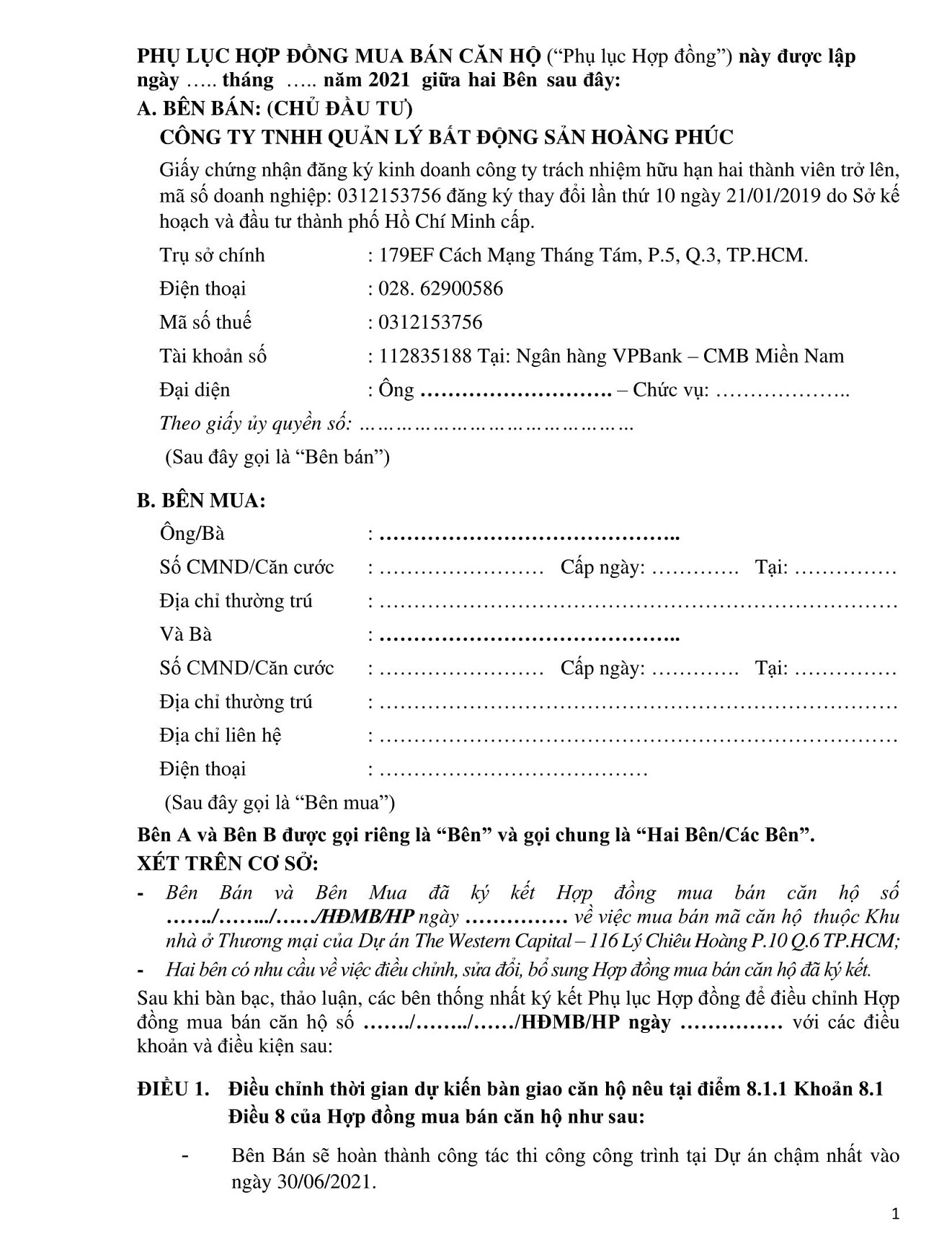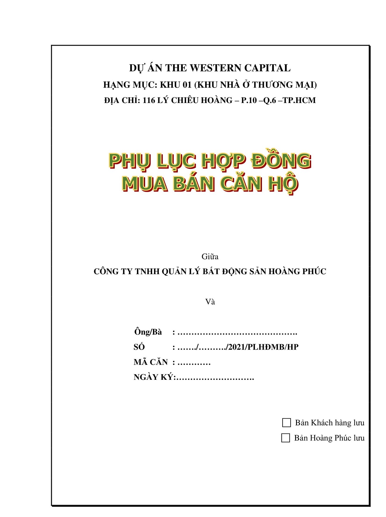 Công ty Hoàng Phúc xin gửi tới Quý khách hàng Dự thảo Phụ lục Hợp đồng mua bán gia hạn thời gian bàn giao (đối với những căn hộ có thời hạn bàn giao Tháng 12/2020) tại Dự án The Western Capital. Trường hợp Quý khách hàng có ý kiến về nội dung dự thảo PLHĐMB nêu trên xin vui lòng liên hệ Phòng Dịch vụ khách hàng theo số điện thoại: 028.6290.3015 - 028.6290.3016 để được hỗ trợ sắp xếp lịch làm việc với đại diện Ban Giám Đốc Công ty Hoàng Phúc.