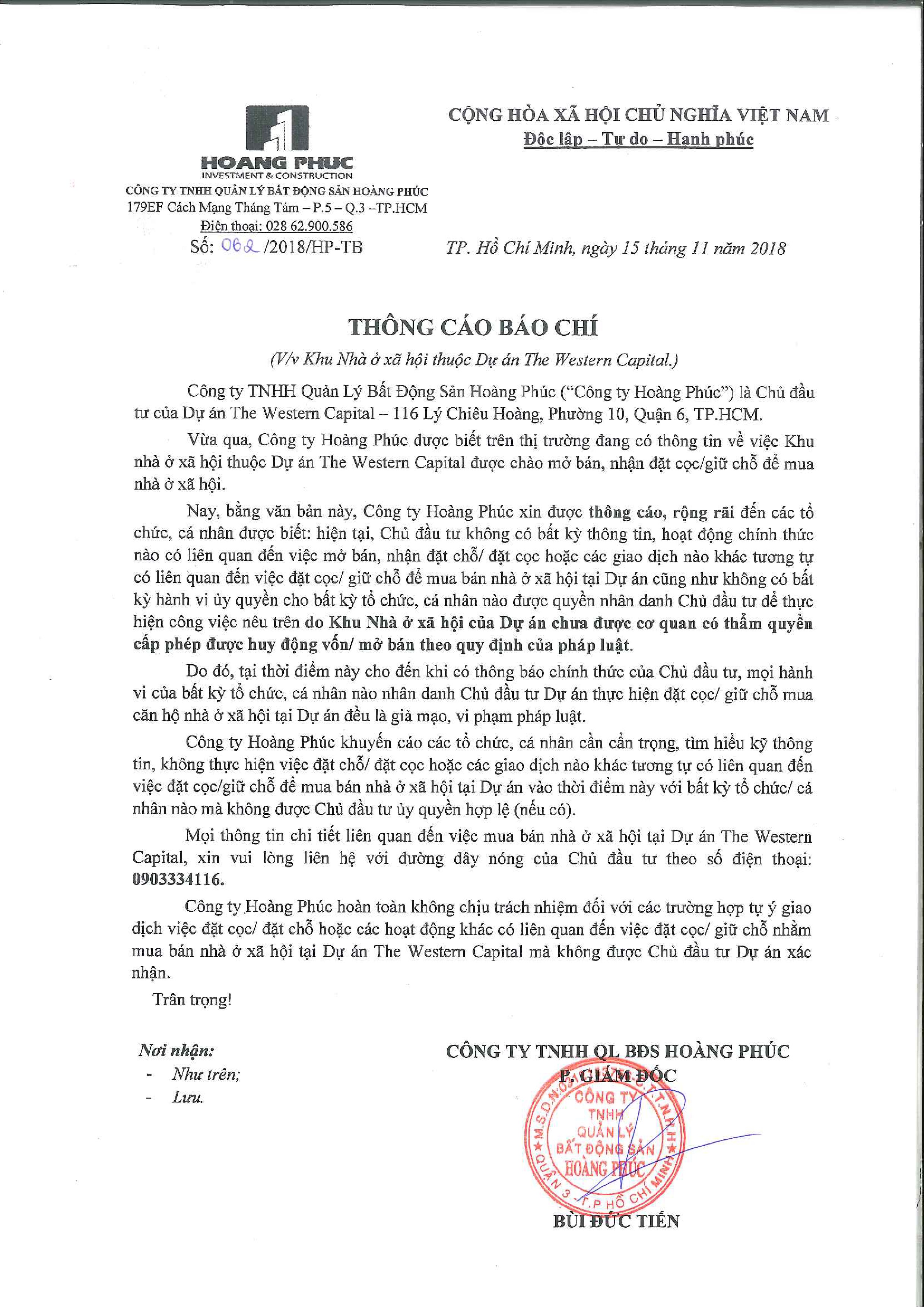 THÔNG BÁO VỀ VIỆC CHƯA MỞ BÁN NHÀ Ở XÃ HỘI DỰ ÁN THE WESTERN CAPITAL